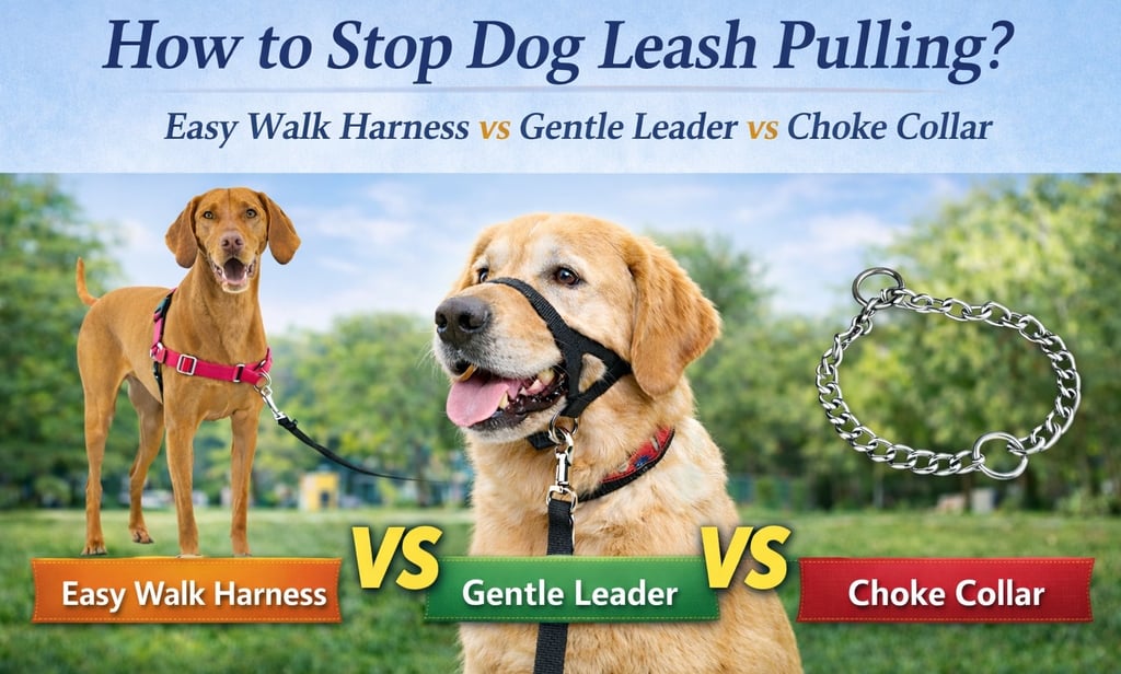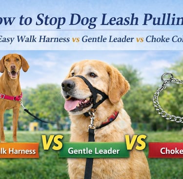 Dog pulling on walks? We compare three popular no-pull solutions - front-clip harnesses, head collars, and choke collars - to help you choose what actually works.