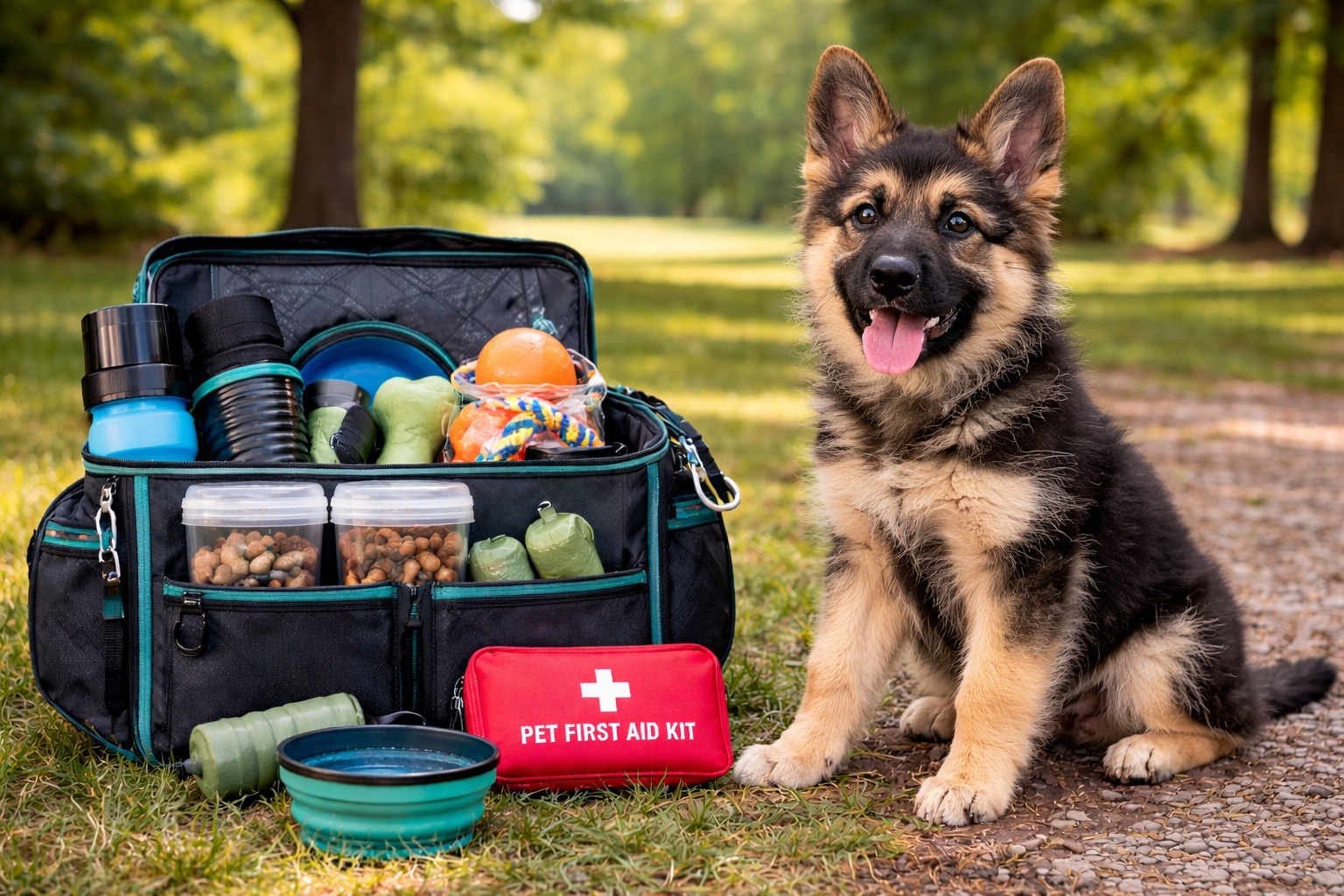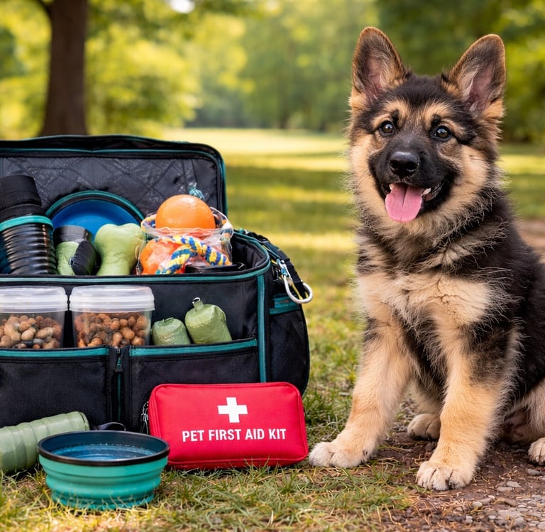 Food • Water • Bowls • Treats • Toys • Leash • Harness • Poop Bags • Bed/Blanket • Medications • Wipes • ID Tags • First Aid Kit • Travel Bottle • Car Safety Gear